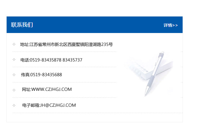 地址:常州市新北區友邦商務大廈1幢16、17層  電話:0519-85101652  傳真:0519-85112595  郵編:213022  網址:www_cz-jiayue_cn.nnjljszp.com  郵箱:xiajifengaa@163.com